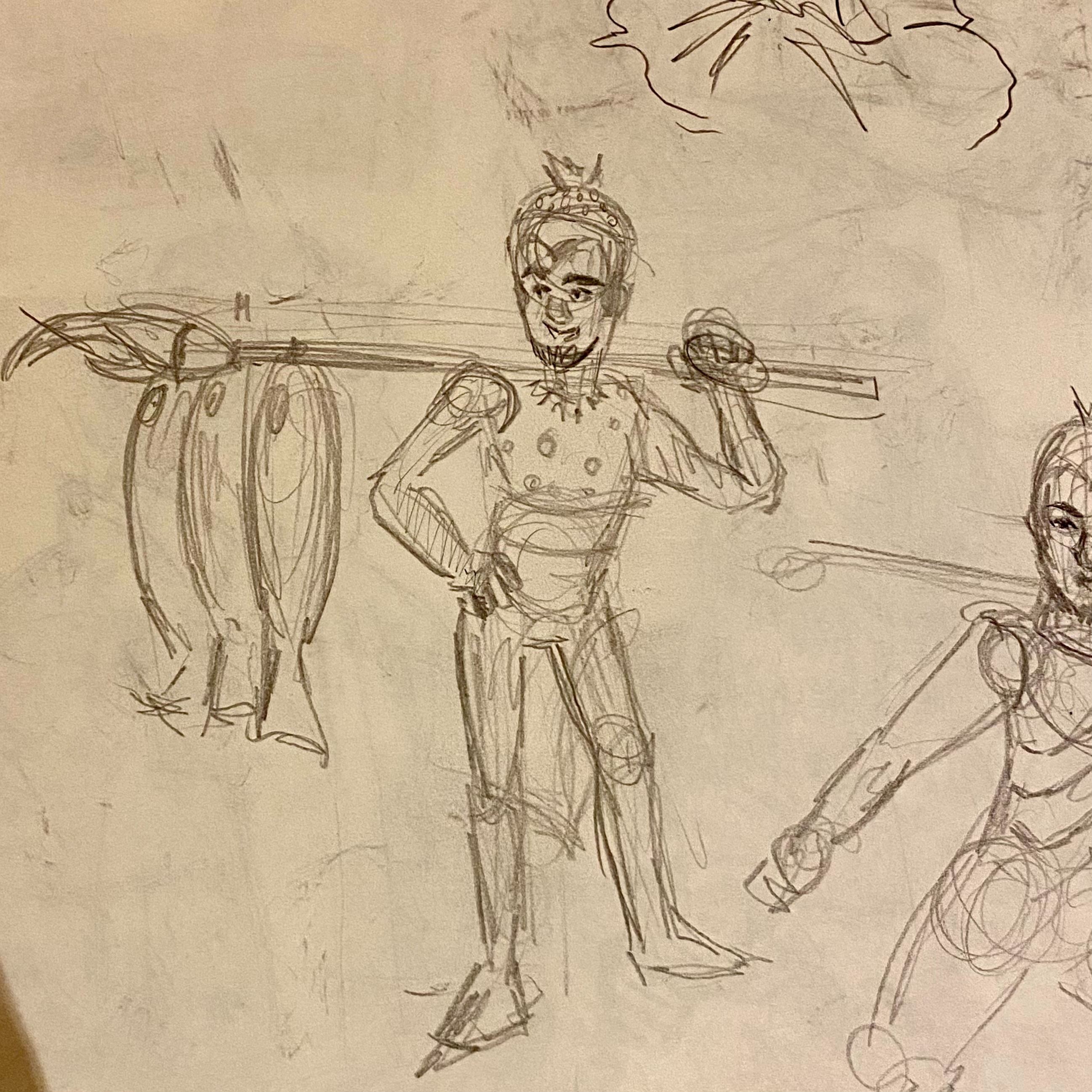 I sketched a character design of a man from Atlantis in the style of the armorfrom the Minoan / Sea People inspiration. I incorporated a cartoon style that fits with the other Boom Beach character designs. I gave the character a crab claw that he carries fish on.